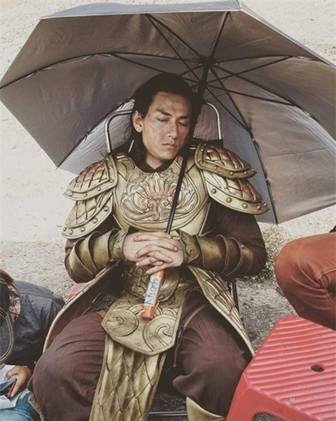 Dù mặc bộ áo giáp nặng trịch nhưng Isaac vẫn cầm ô và ngủ ngon lành.