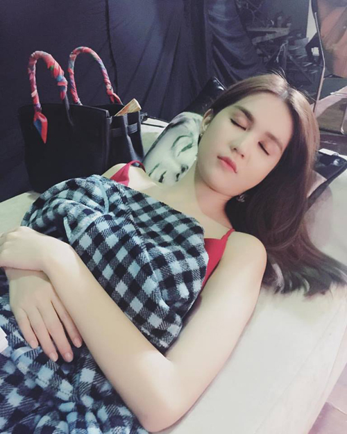 Có mặt tại một buổi chụp ảnh, do phải liên tục thay đổi kiểu tóc và make-up sau mỗi set đồ nên sau khi trang điểm hoàn tất, Ngọc Trinh tranh thủ chợp mắt nhanh chóng để giữ sức và vẻ tỉnh táo trong buổi chụp dài.