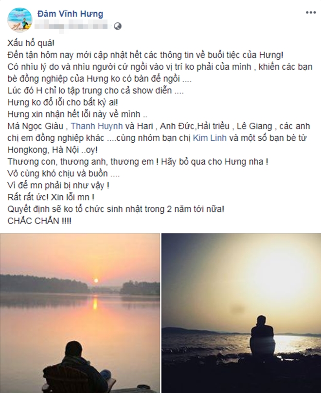 Sau đó vài ngày, khi Đàm Vĩnh Hưng hay biết được câu chuyện trên và lập tức gửi lời xin lỗi đến tất cả khách mời vì đã không thể sắp xếp mọi thứ chu toàn đến phút cuối. Chưa dừng lại ở đó, nam ca sĩ còn quyết định trong 2 năm tới sẽ không tổ chức sinh nhật nữa.