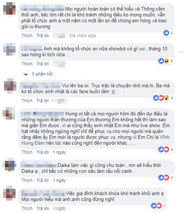 Tính Đàm Vĩnh Hưng luôn cẩn thận, chu toàn mọi thứ trước nay khán giả đều đã rõ nên nhiều người không khỏi buồn cho sự cố ngoài ý muốn này khiến niềm vui tuổi mới của anh bị ảnh hưởng. Ngoài việc an ủi “ông hoàng nhạc Việt” đừng quá để tâm những chuyện đã xảy ra vì anh đã cố gắng hết sức, cư dân mạng cũng tỏ rõ sự tiếc nuối vì “anh mà không tổ chức sinh nhật nữa showbiz có gì vui?“.