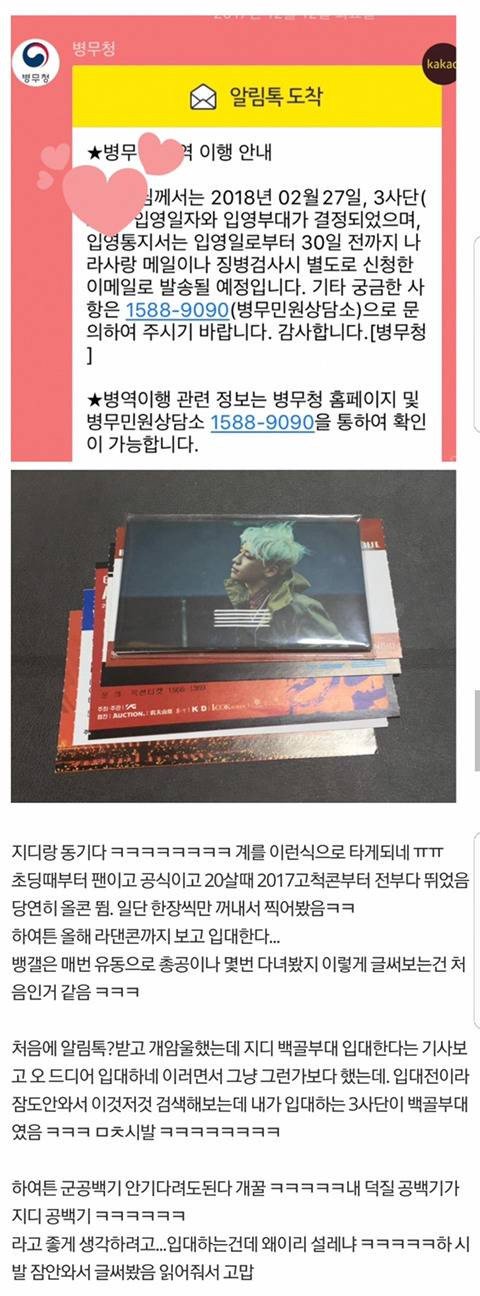 “Ban đầu, khi nhận được tin nhắn thông báo nhập ngũ, tôi đã khá buồn. Sau đó, tôi đọc được tin tức G-Dragon cũng đăng ký vào bộ phận White Skull. Và rồi đó là đêm trước khi nhập ngũ, tôi không thể ngủ được vì vậy bản thân chỉ tìm kiếm trực tuyến, và bộ phận bộ binh 3 của tôi chính là bộ phận White Skull” - anh chàng không thể tưởng tượng được có sự trùng hợp như vậy.