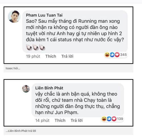 Isaac từng khiến các fan thích thú khi hỏi thằng Liên Bỉnh Phát: “Không có người đàn ông nào tuyệt vời như anh?” Về phía mình Liên Bỉnh Phát vẫn im lặng và vui vẻ hài hước, anh không có bất kỳ bình luận nào trước thông tin này.
