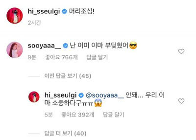 Ngoài ra, mới đây, khi Seulgi (Red Velvet) đăng tải một bức kèm theo dòng trạng thái “Cẩn thận đầu nhé!” lên trên Instagram, thì cô nàng Jisoo cũng đã bình luận là: “Em từng bị đụng đầu ở đây nè.” Sau đó Seulgi cũng đã trả lời là: “Ôi không… Những cái trán quý giá của chúng ta ㅠㅠ”