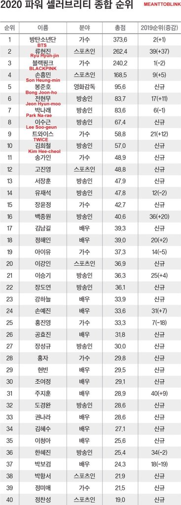 Trong danh sách 40 người nổi tiếng quyền lực nhất tại Hàn Quốc năm 2020, đánh giá bởi các tiêu chí như phương tiện truyền thông, mạng xã hội, truyền hình, thu nhập, BTS vẫn giữ vị trí đầu tiên. Trong khi đó, BlackPink đứng thứ 3.