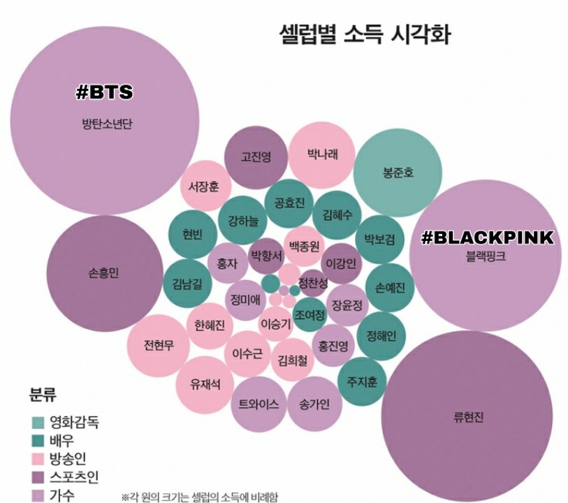 Biểu đồ mô phỏng lại thu nhập của các ngôi sao nổi tiếng nhất tại Hàn Quốc, với BTS và BlackPink chiếm phần lớn.