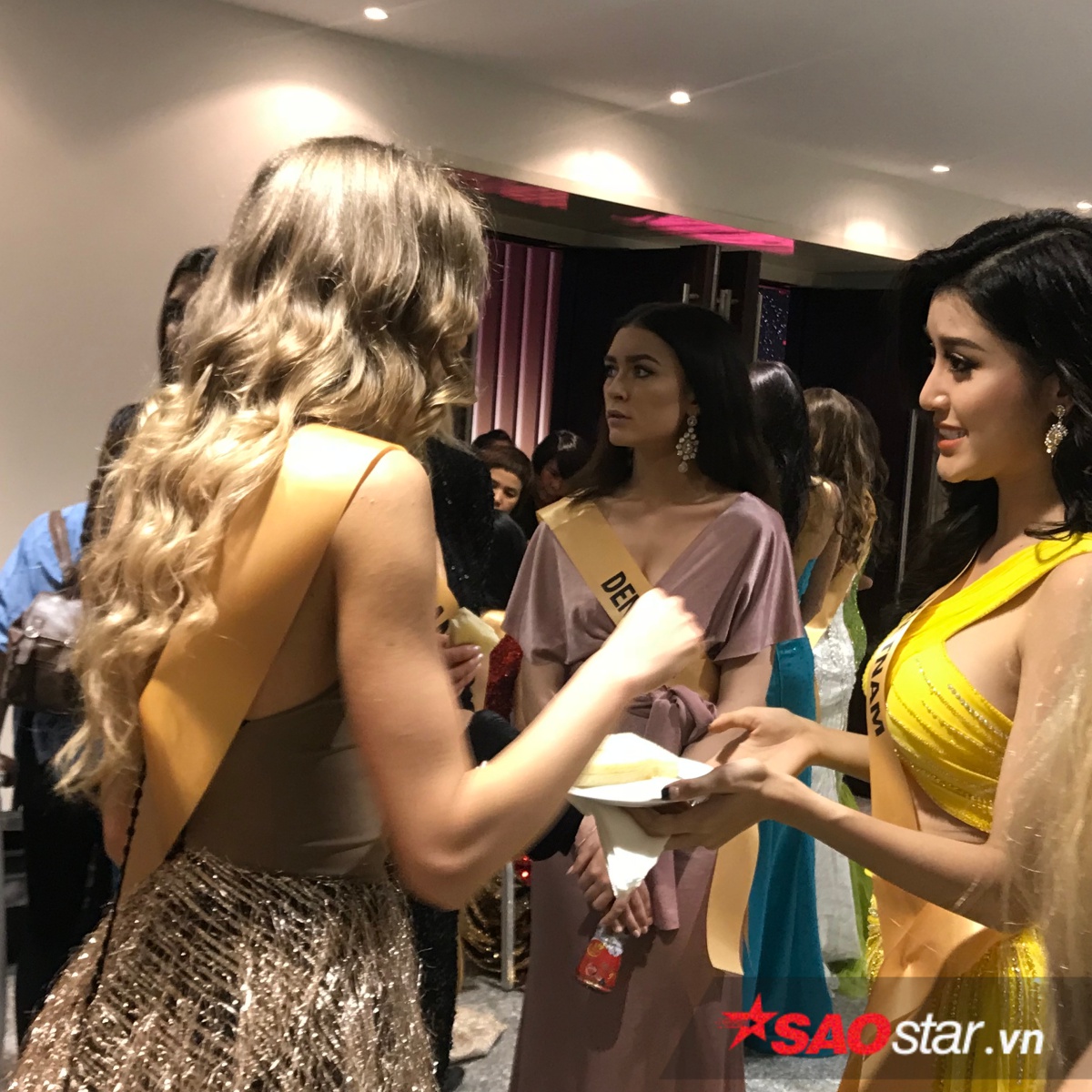 Một khoảnh khắc đẹp khác khi Á hậu Huyền My ân cần chỉnh lại trang phục cho Miss Bahamas.