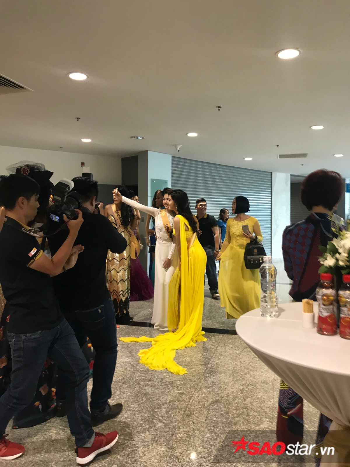 Người đẹp gốc Hà thành xuất hiện rạng rỡ với bộ đầm dạ hội màu vàng thu hút mọi ống kính máy ảnh. Với tư cách là đại diện nước chủ nhà, Á hậu Việt Nam 2014 ghi điểm qua loạt khoảnh khắc thân thiện cùng các đối thủ.