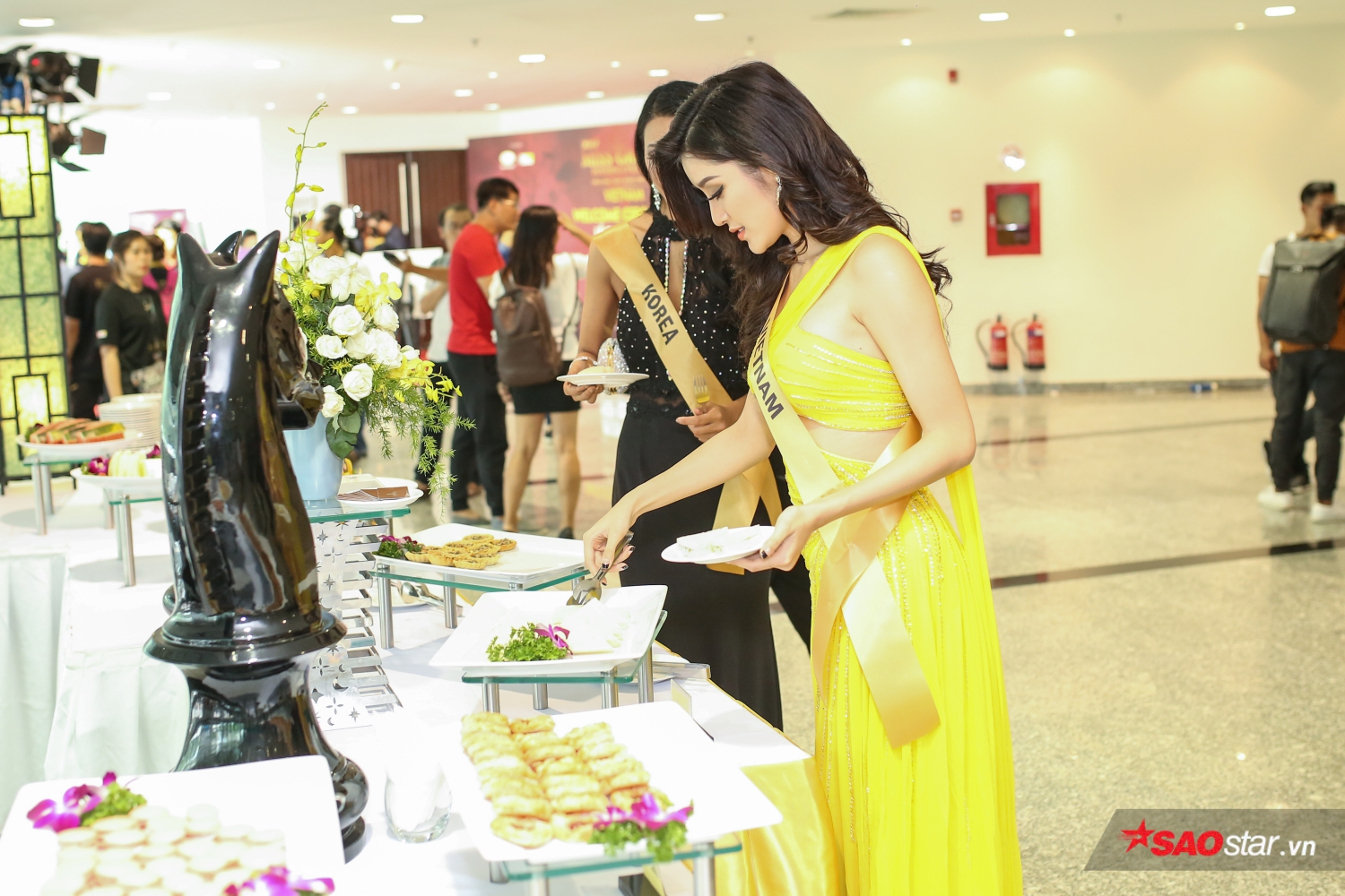 Á hậu Việt Nam 2014 cũng tranh thủ nhờ đại diện Hàn Quốc cùng mình làm công việc này để có thể mang nhiều phần thức ăn hơn cho các người đẹp khác.