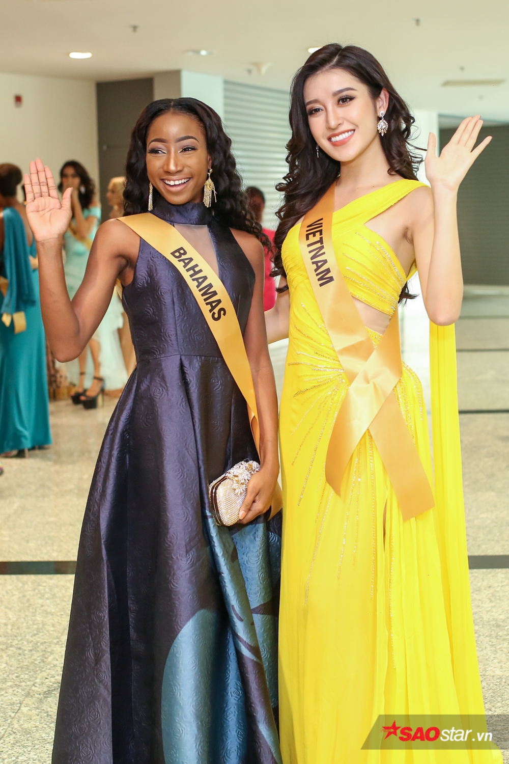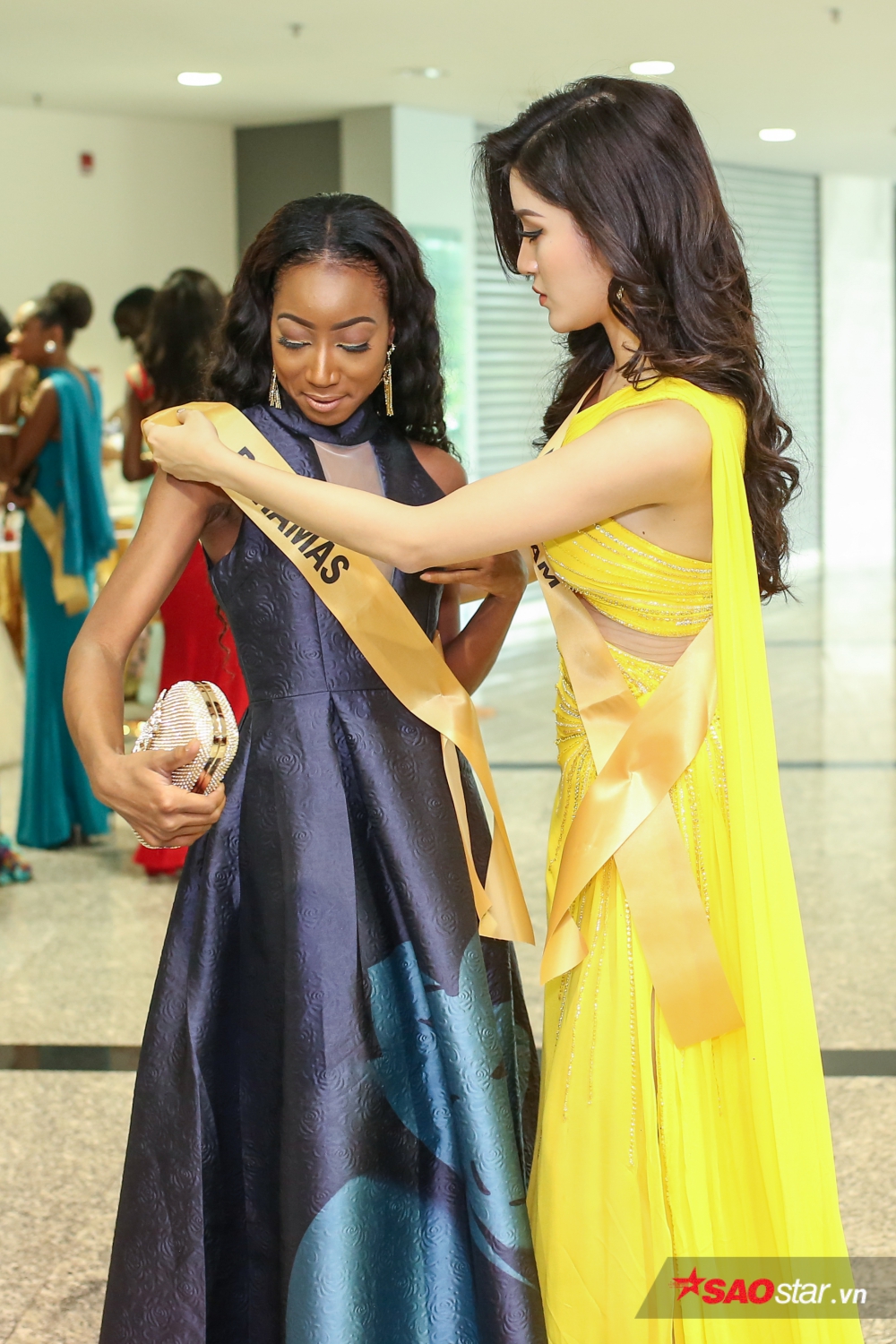 Đại diện Bahamas tỏ ra rất vui khi nhận được sự giúp đỡ từ thí sinh nước chủ nhà. Cả hai cười tươi khi bắt gặp ống kính máy ảnh.
