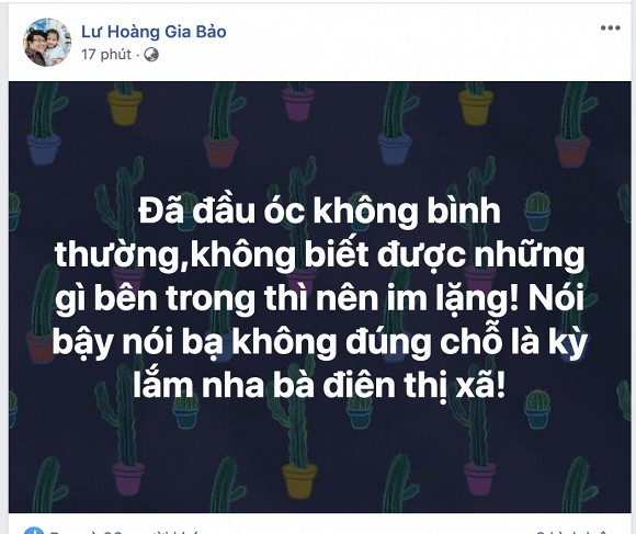 Không đứng ngoài cuộc, nhiều nghệ sĩ trong showbiz Việt cũng đã có những động thái phản ứng. Mới đây, trên trang cá nhân, diễn viên Gia Bảo - người bạn thân thiết với cố diễn viên Mai Phương đã đăng tải một dòng status ẩn ý bày tỏ sự không hài lòng với Lan Phương. Anh bức xúc viết: “Đã đầu óc không bình thường, không biết được những gì bên trong thì nên im lặng! Nói bậy nói bạ không đúng chỗ là kỳ lắm nha bà điên thị xã!”.