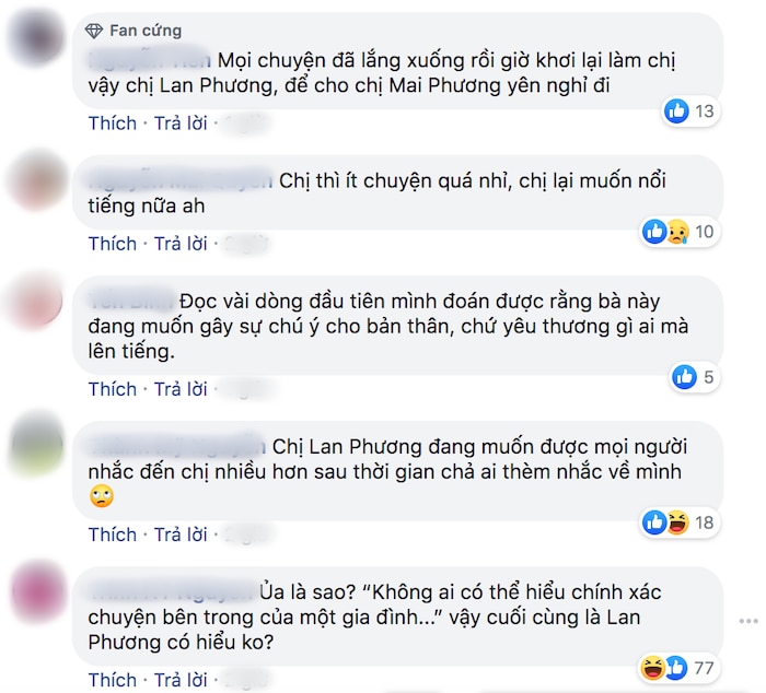 Nữ diễn viên chia sẻ thêm: “Có điều mọi người không muốn hiểu về điều tôi viết. Họ chỉ muốn tập trung vào vài câu chữ của tôi để tiếp nối cơn giận dữ của họ”. Điều này càng khiến cư dân mạng phẫn nộ và vào trang cá nhân của Lan Phương để tiếp tục ném đá.
