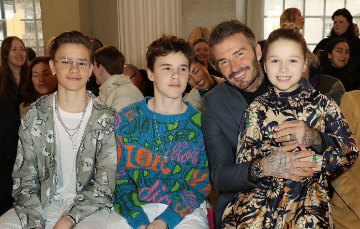 Ngồi ở hàng ghế đầu, David Beckham bế con gái Harper lên đùi, còn hai con trai Romeo và Cruz ngồi cạnh họ. Huyền thoại bóng đá trông rất hào hứng với show diễn thời trang, anh thường xuyên bị bắt gặp đang cười tít mắt với hai đứa con trai. ‘Công chúa út’ Harper mới 8 tuổi nhưng đã thừa hưởng gu thời trang sành điệu của mẹ. Cô bé mặc một chiếc váy hoa dài và búi tóc cao.