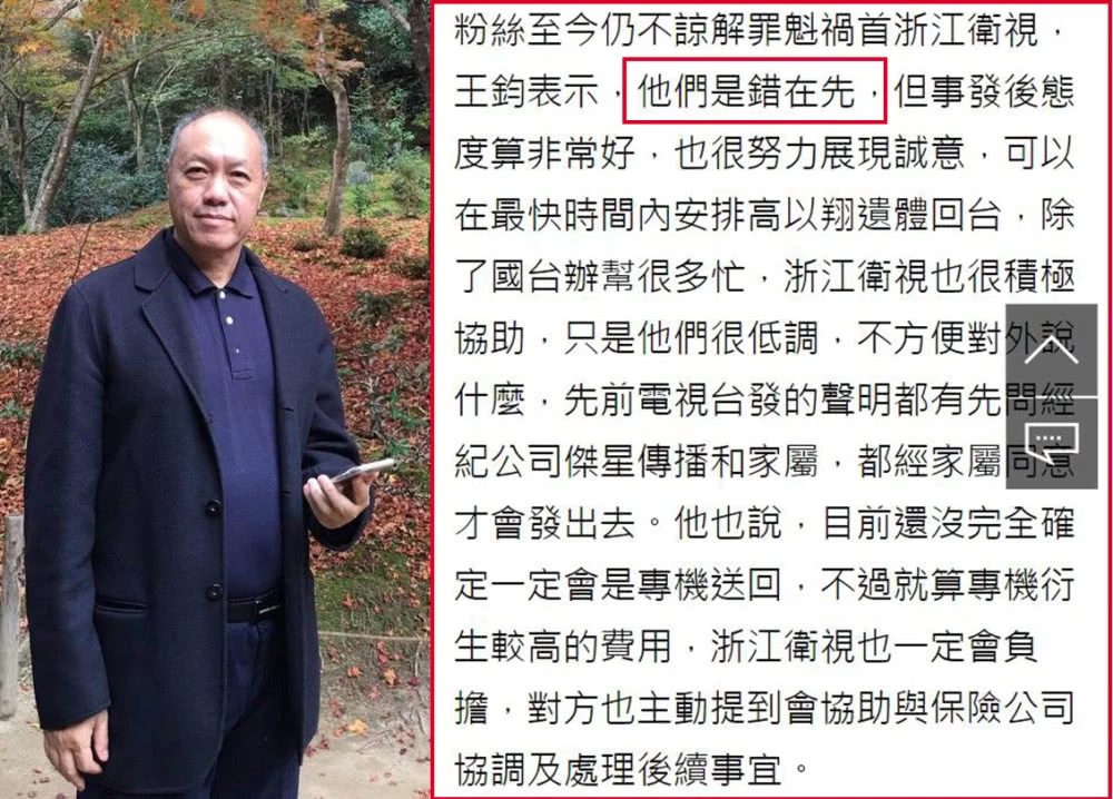 Cùng lúc đó, một phóng viên đăng tải bài báo cáo cụ thể về những gì có liên quan cái chết của Cao Dĩ Tường. Họ từ nhà tang lễ Ninh Ba vẫn luôn theo di thể Cao Dĩ Tường đến nhà tang lễ Hàng Châu. Đồng thời tiết lộ di thể Cao Dĩ Tường được đưa đến Hàng Châu là tâm nguyện của người nhà, họ hy vọng đem di thể anh về đến Đài Loan mới hỏa táng, mà chỉ có nhà tang lễ ở Hàng Châu mới có kỹ thuật xử lý giúp di thể tránh bị thối rửa.