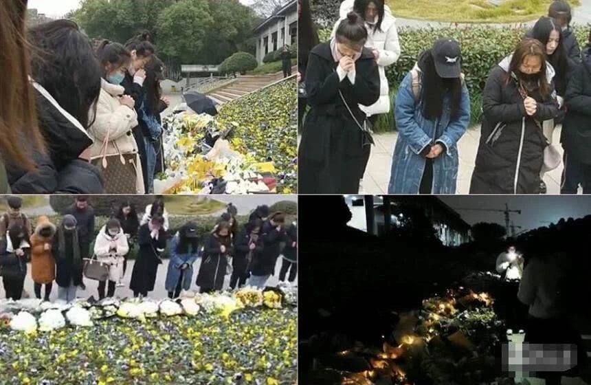 Trước nhà tang lễ trải đầy hoa cúc trắng vàng, hết bó hoa này đến bó hoa khác, có thể hơn cả trăm bó. Cho dù thời tiết lạnh giá đến đâu, fan hâm mộ cũng không có ý định rời khỏi, đến cả ăn cơm cũng đặt mua bên ngoài, dùng cơm bên ngoài nhà tang lễ.