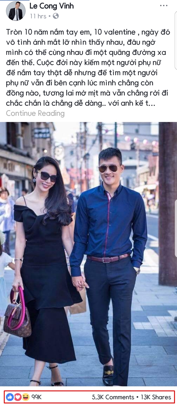 Mới đây, chia sẻ của Công Vinh tặng vợ nhân dịp Valentine nhận được sự ủng hộ lớn từ cộng đồng mạng. Tuy không hoạt động nghệ thuật nhưng fanpage của danh thủ điển trai cũng có lượt theo dõi vượt ngưỡng 1 triệu.