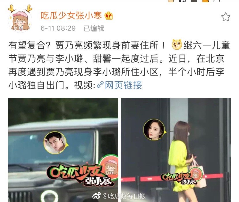 Mới đây, truyền thông chụp được hình ảnh Giả Nãi Lượng ra vào nơi ở của Lý Tiểu Lộ, nửa tiếng sau “ảnh hậu trẻ nhất Kim Mã” một mình ra khỏi cửa. Thậm chí, cả hai còn mặc đồ đôi quay video, nghi ngờ họ tái hợp dù đã ly hôn. Rất nhiều cư dân mạng lên tiếng bày tỏ hy vọng “cặp đôi một thời” tái hôn lại với nhau.