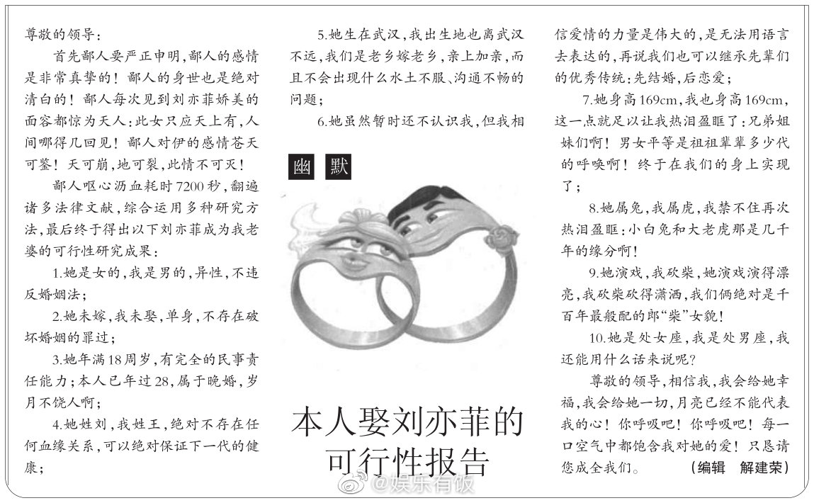 Theo như trang Pengpai News đưa tin, dân mạng phản ánh một bài viết “Báo cáo tính khả thi về việc tôi kết hôn với Lưu Diệc Phi” được đăng lên tạp chí Pháp chế chính phủ kỳ 36 năm 2010. Mặc dù bài viết này có chứa từ hài hước nhưng nội dung lại mang tính thô tục, liệu một tạp chí pháp chế cấp tỉnh như thế có thể xuất bản bài báo với nội dung như vậy không?