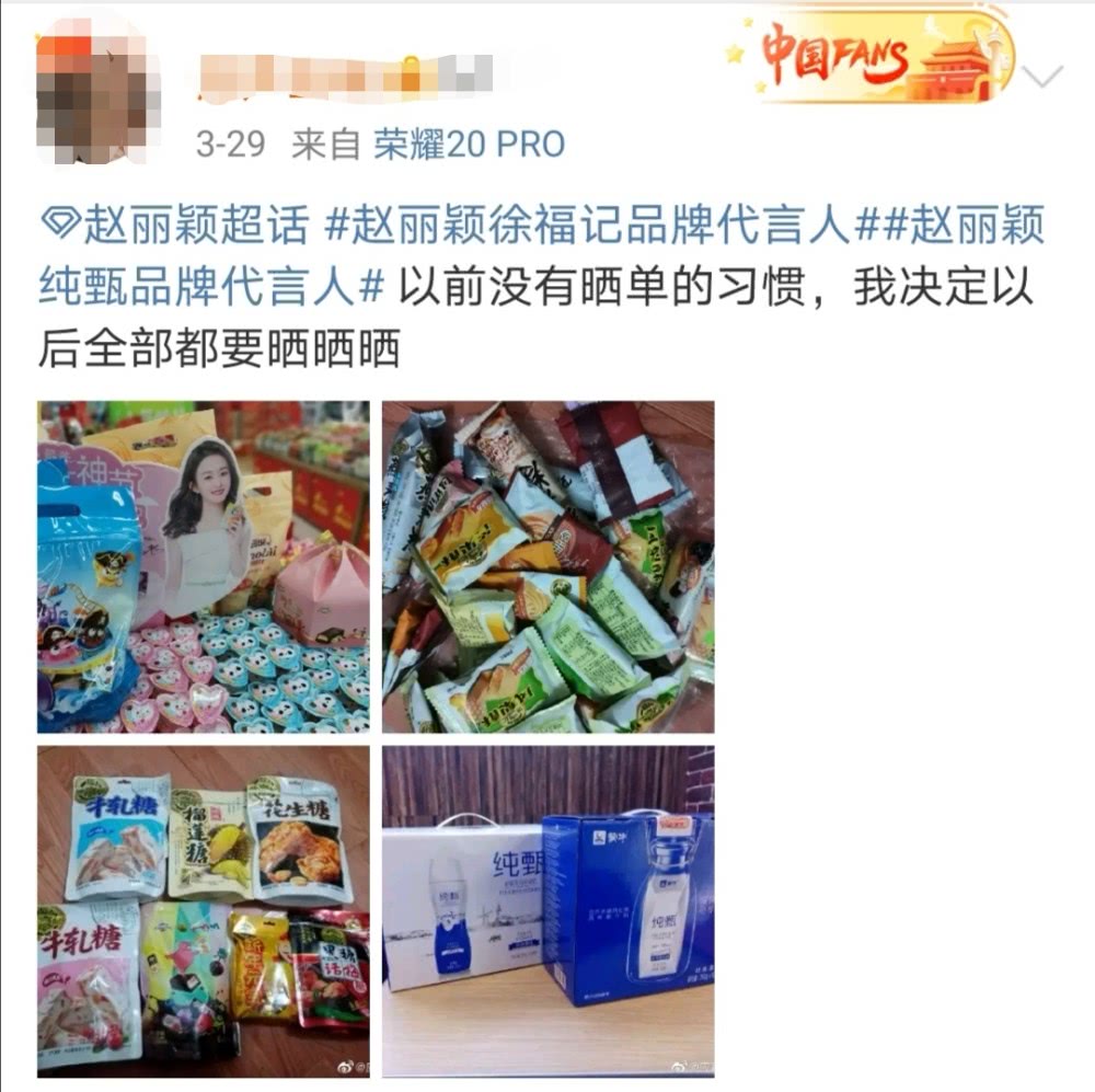Cuối tháng 12 năm 2019, Hsu Fu Chi cũng đã thông báo Triệu Lệ Dĩnh là người đại diện mới. Trùng hợp vào năm mới, fan Triệu Lệ Dĩnh bắt đầu trào lưu khoe hóa đơn để chứng minh đã mua sản phẩm ủng hộ cho thần tượng. Sức mua hàng của họ làm nhiều người kinh ngạc, không ít ý kiến cảm thán giá trị thương mại của Triệu Lệ Dĩnh thật cao.