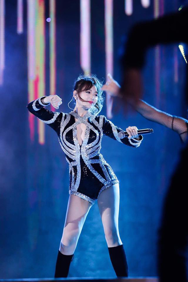 Tự tin diện trang phục bó sát khi biểu diễn trên sân khấu.