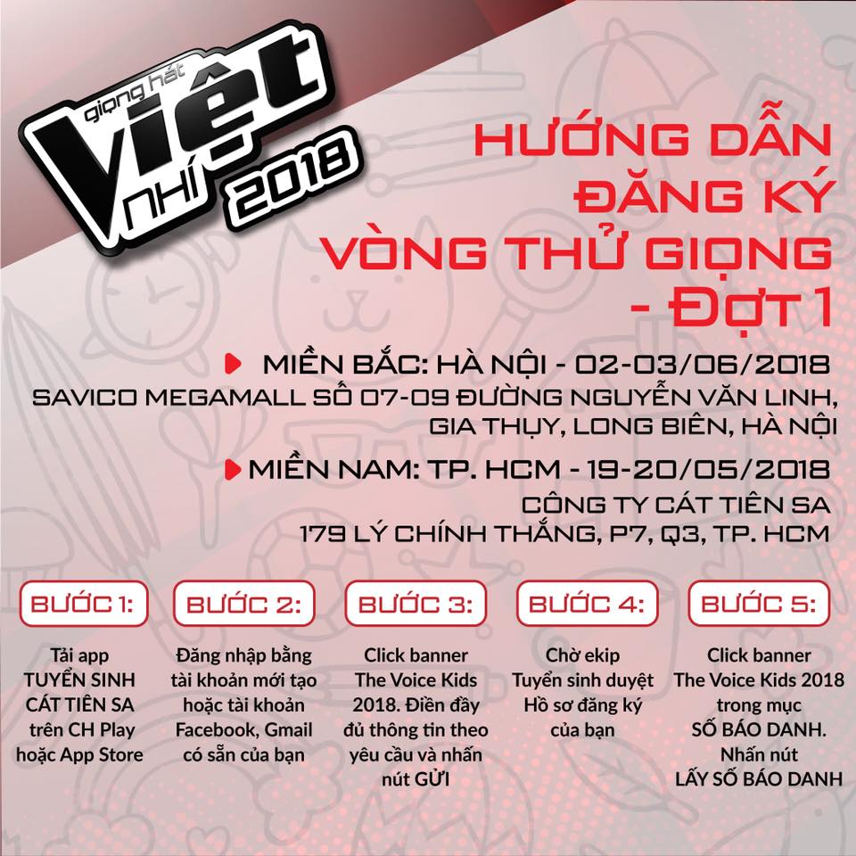 Giọng hát Việt nhí 2018 sẽ diễn ra đợt Sơ tuyển tiếp theo vào ngày 2-3/6 tại Trung tâm thương mại Savico Megamall, số 7 - 9 đường Nguyễn Văn Linh, Quận Long Biên, Hà Nội. Ngay sau khi kết thúc vòng Sơ tuyển, chương trình sẽ chính thức bước vào vòng Giấu mặt với sự tham gia trực tiếp của dàn HLV mới mẻ năm nay.