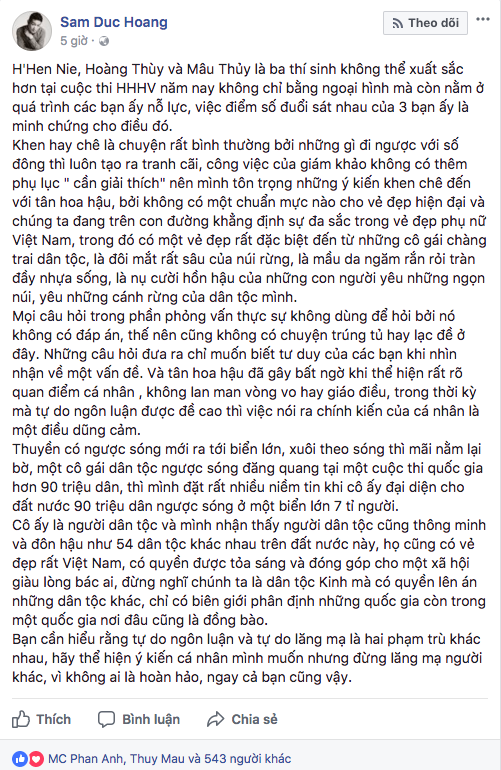 Trước những ý kiến đó, giám khảo Hoa hậu Hoàn vũ Việt Nam Hoàng Đức Sâm (Samuel Hoàng) đã lên tiếng bênh vực, phân tích về chiến thắng của H'Hen Niê.
