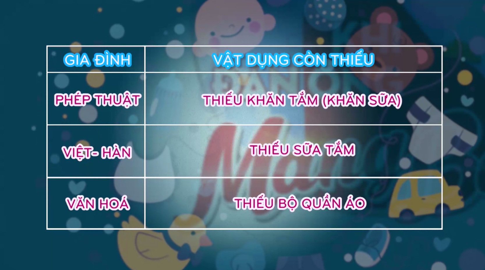 Sau thời gian “căng não”, cả hai vị khách mời đã đưa ra quyết định: “Đầu tiên phải đúng và đủ, ba đội đã đúng rồi, mình sẽ không quan trọng cái giá nữa. Các ông bố ba mẹ trải nghiệm được thử thách này để sau này có thể chăm sóc cho bé tốt hơn, cẩn thận hơn. Và nhất là các cô bán hàng dù có xinh đẹp đến đâu đi nữa cũng không nghe lời, không mất tập trung”. Và kết quả, đội về nhất là gia đình Phép thuật với 15 điểm, tiếp theo là gia đình Vệt - Hàn với 10 điểm và cuối cùng là Kỳ Vĩ với 5 điểm. Như vậy, đội dành chiến thắng trong thử thách đầu tiên là cặp đôi Song Giang.