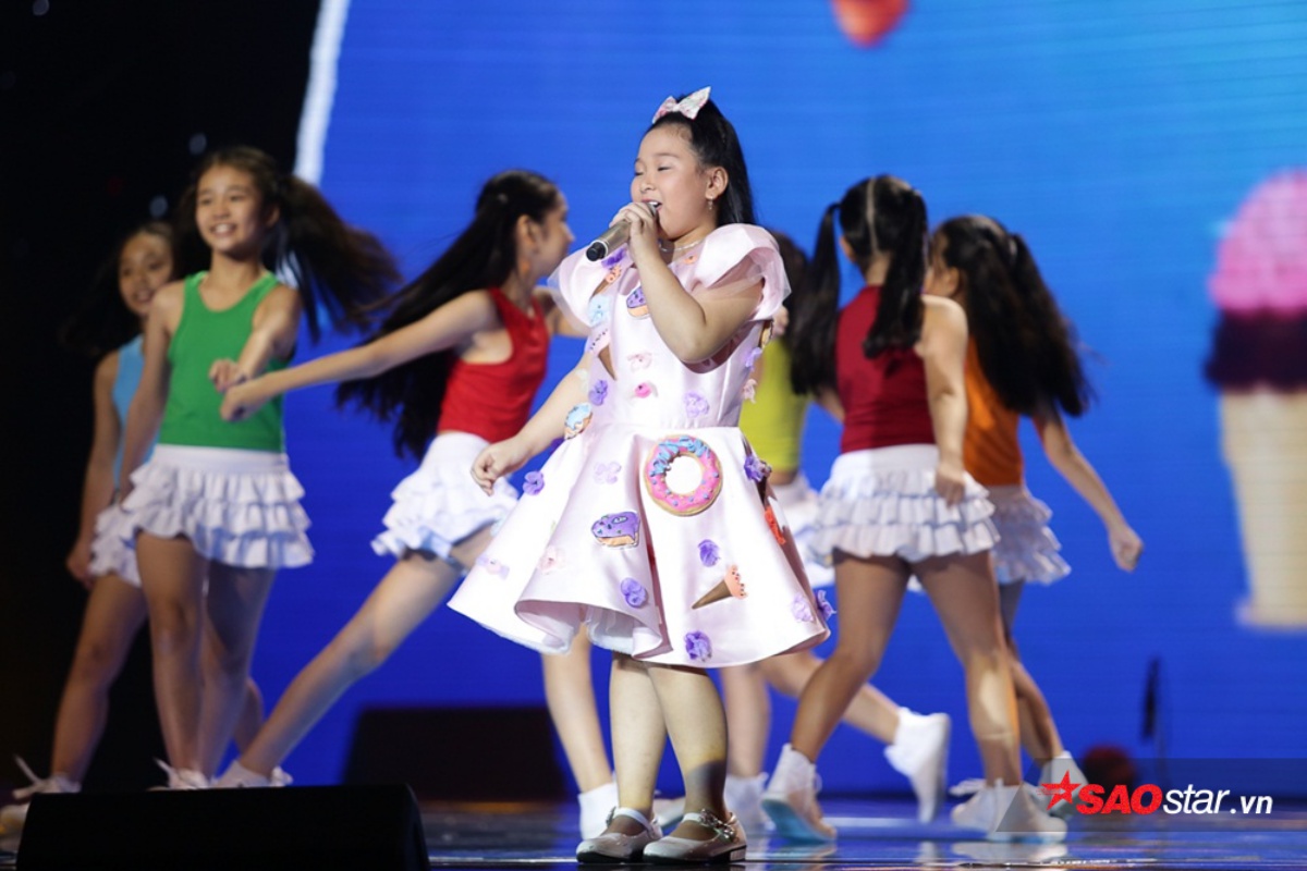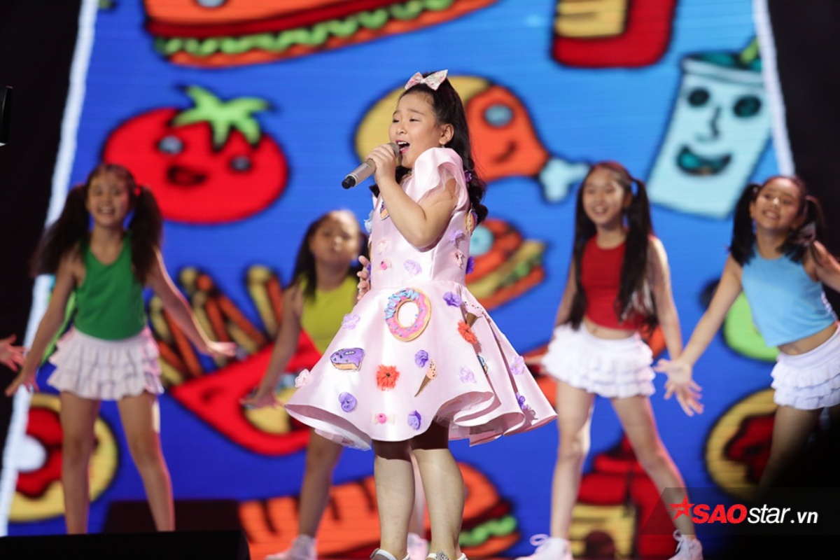 Thanh Ngân xinh xắn tự tin trình diễn ca khúc Chiếc bụng đói do HLV Tiên Cookie sáng tác.