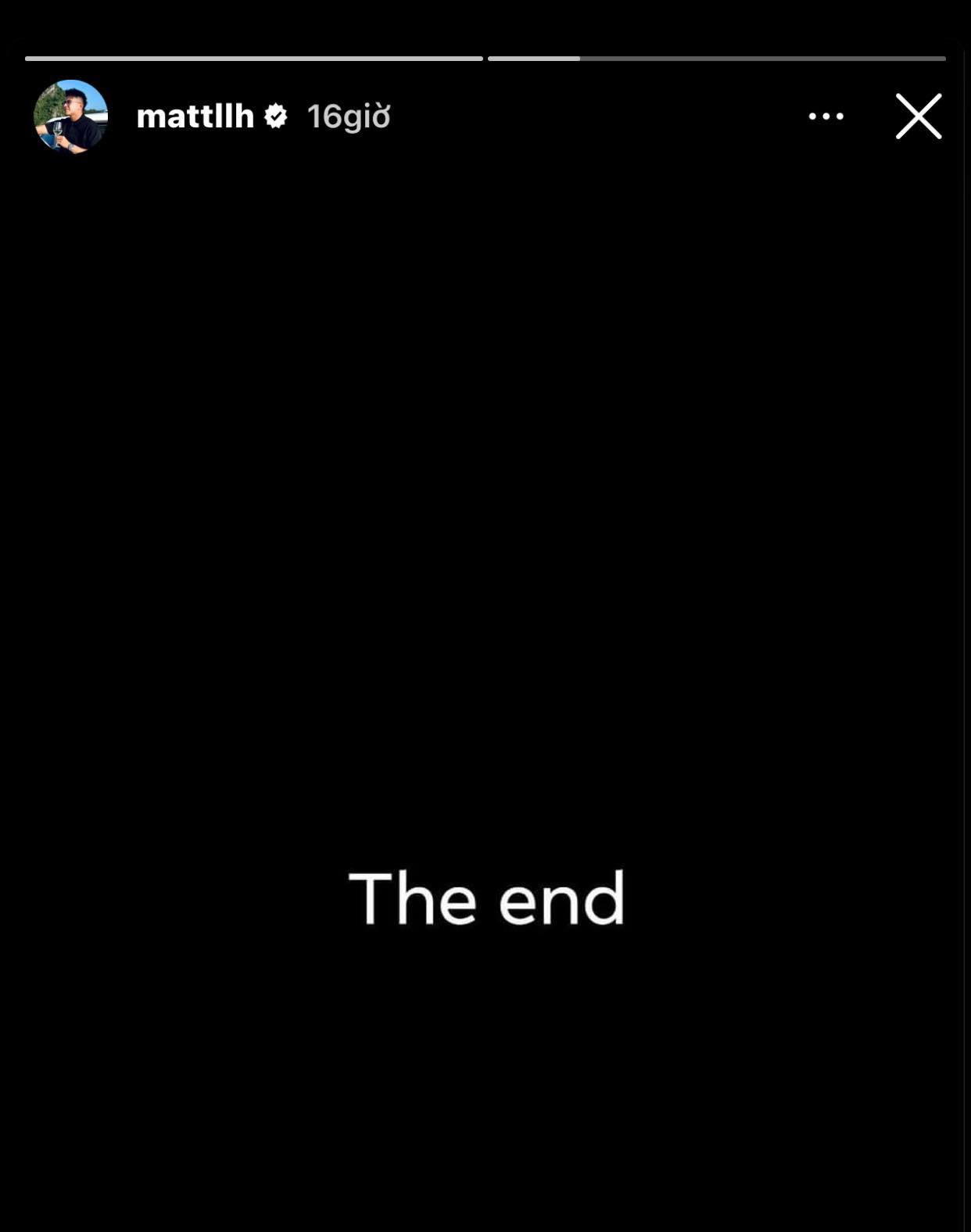 Mới đây, trên story Matt Liu bất ngờ đăng tải dòng chữ: "The end" (Tạm dịch: Kết thúc) trên nền đen. Động thái khó hiểu này của bạn trai Hương Giang khiến công chúng thêm tò mò. Đây không phải lần đầu tiên Matt Liu có động thái gây chú ý đến vậy.