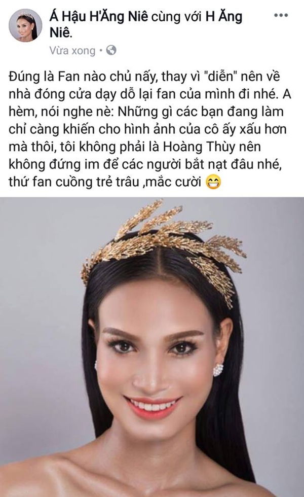Không chỉ dừng lại ở việc mỉa mai, H'Ăng Niê còn tiếp tục mượn vụ việc Á hậu Hoàng Thùy bị chê xấu và so sánh với H'Hen Niê để “lên đời” dạy bảo fan: “Tôi không phải là Hoàng Thùy nên không đứng im để các người bắt nạt đâu nhé. Thứ fan cuồng trẻ trâu, mắc cười”. Dù đã cố giải thích chưa bao giờ ám chỉ ai, chỉ trích ai, lên án ai. Nhưng trước những động thái có phần tiêu cực này, H'Ăng Niê có lẽ đang tự “đào hố” tố cáo mình.
