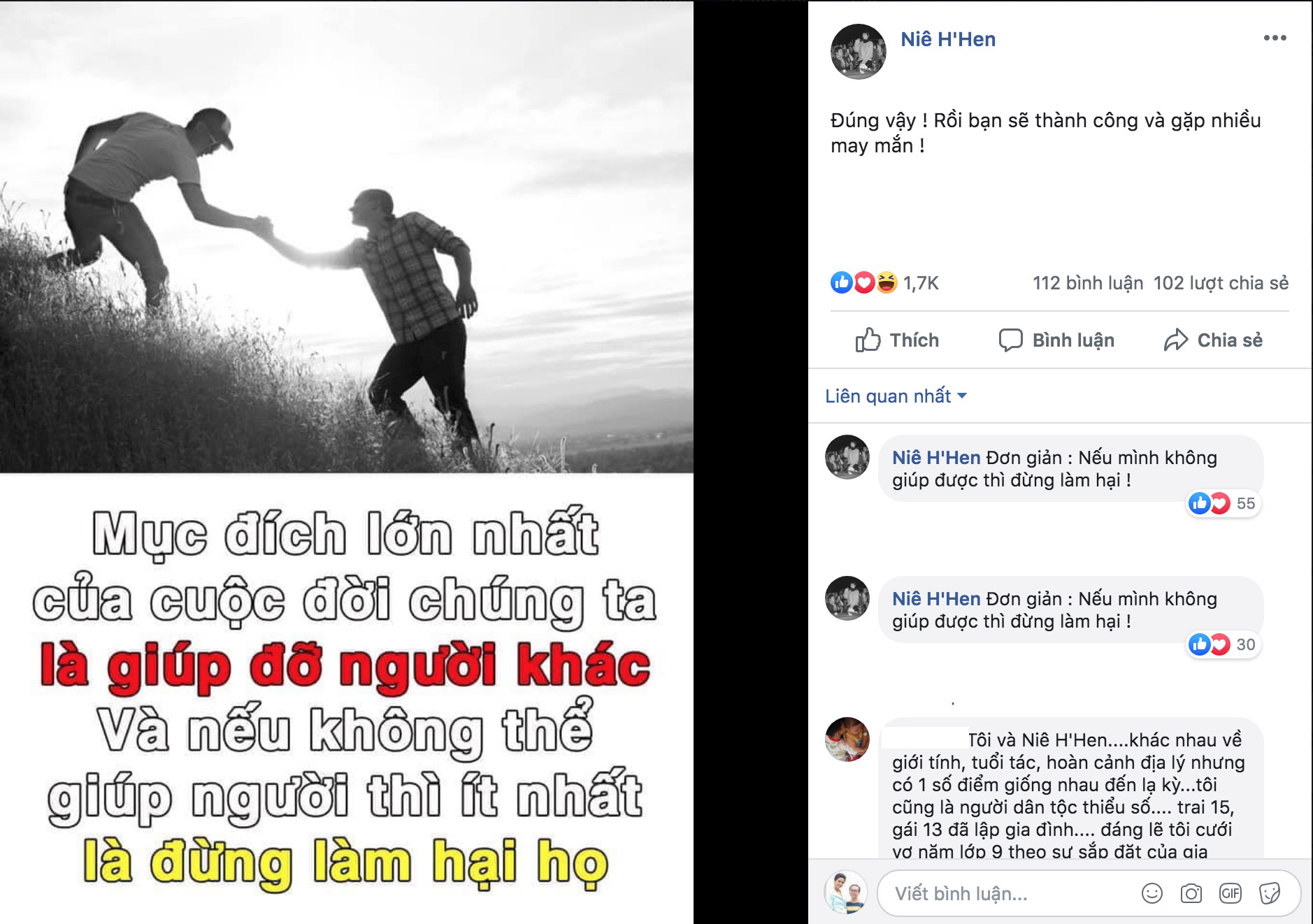 Trước làn sóng bị mỉa mai bởi cô bạn đồng hương, Top 5 Hoa hậu Hoàn Vũ Thế Giới - H'Hen Niê cũng đăng tải dòng trạng thái kèm bức ảnh đầy ẩn ý với nội dung: “Mục đích lớn nhất của cuộc đời chúng ta là giúp đỡ người khác. Và nếu không thể giúp người thì ít nhất là đừng làm hại họ”. Bên dưới phần bình luận, hoa hậu còn nhấn mạnh: “Đơn giản! Nếu mình không giúp được thì đừng làm hại!”. Trước những lời lẽ gây hiểu lầm, H'Hen Niê tự động viên bản thân: “Đúng vậy ! Rồi bạn sẽ thành công và gặp nhiều may mắn!”.