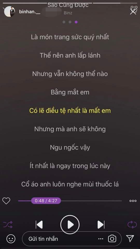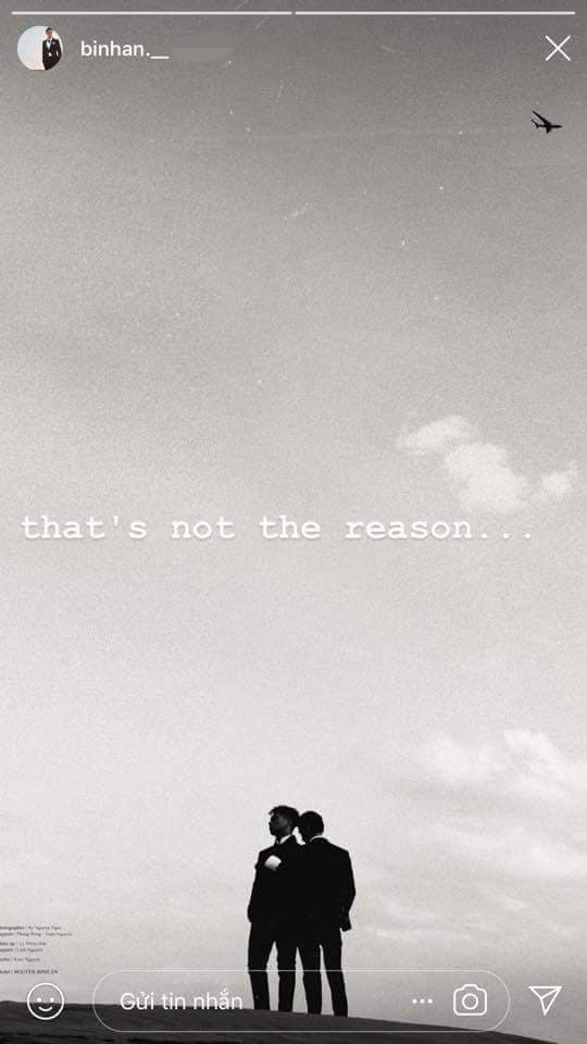 Tuy nhiên, mới đây, trên trang cá nhân nam diễn viên Bình An bất ngờ đăng tải những dòng trạng thái u buồn. Anh chia sẻ ảnh chụp màn hình ca khúc Sao cũng được của Binz và nhấn mạnh ở câu “Có lẽ điều tệ nhất là mất em”. Ngoài ra, Bình An còn viết những dòng tâm trạng bằng tiếng Anh: “That’s not the reason” (Tạm dịch: Đó không phải là lý do).
