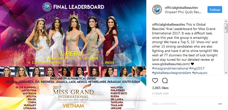 Global Beauties vừa công bố bảng xếp hạng Top 15 của đêm chung kết Hoa hậu Hòa bình Thế giới 2017.