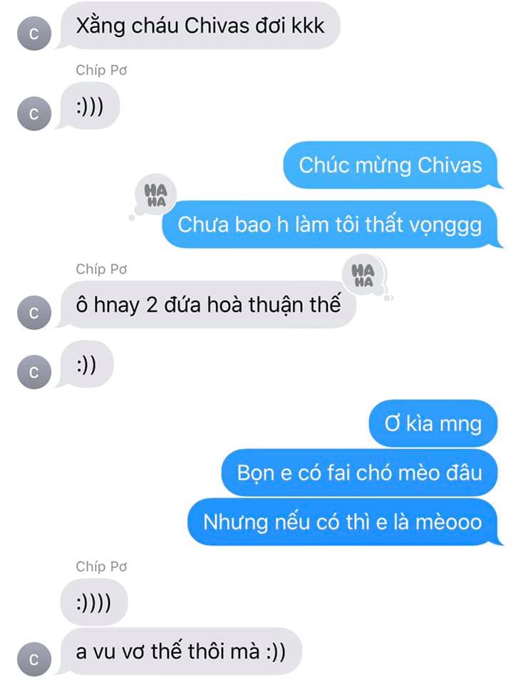 Và “Vua Ả rập” đã đáp lại “Em không lắp sim nên không nhận được tin nhắn đâu”. Có vẻ, Huyền My và Đức Huy vô cùng thân thiết ngoài đời. Huyền My còn không quên dặn dò Đức Huy mua hộp xôi xoài ở Thái về để ăn mừng.