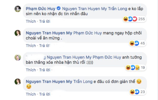 Một người bạn thân thiết với cả hai đã đặt câu hỏi, cứ tưởng rằng bàn thắng của Đức Huy đã xoá nhoà được “hận thù” của cả hai nhưng Á hậu đã lập tức đính chính “Em với con quỷ này chưa bao giờ hoà thuận cả”.