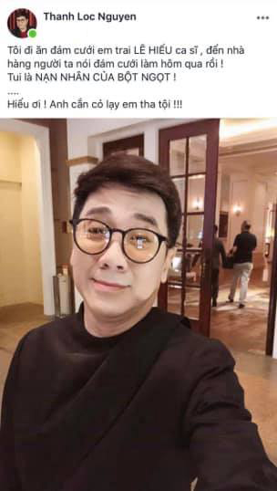 NSƯT bộc bạch với tâm thế tiếc nuối và hối lỗi: “Tôi đi ăn đám cưới em trai Lê Hiếu ca sĩ, đến nhà hàng người ta nói đám cưới làm hôm qua rồi! Tôi là nạn nhân của BỘT NGỌT! Hiếu ơi! Anh cắn cỏ lạy em tha tội”. Đoạn phân trần giải thích cho sự cố đến muộn hơn một ngày trong đám cưới em trai khiến người hâm mộ cười ngả nghiêng và thấy tội cho Lê Hiếu.