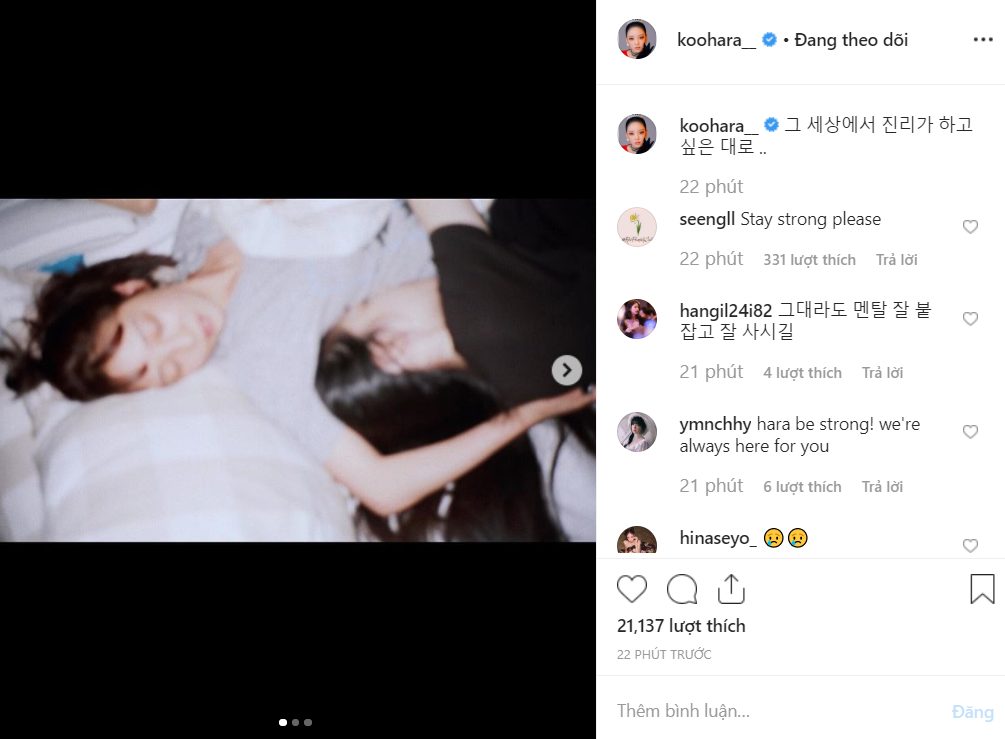 Đúng 12h đêm (KST), Goo Hara bất ngờ đăng tải ảnh chụp của cả hai lên mạng xã hội Instagram kèm theo chú thích: “Ở thế giới bên kia, Jin Ri (tên thật của Sulli), sẽ làm những điều mình muốn”. Trong bức ảnh công khai, họ có những buổi gặp gỡ và ngủ cùng nhau.