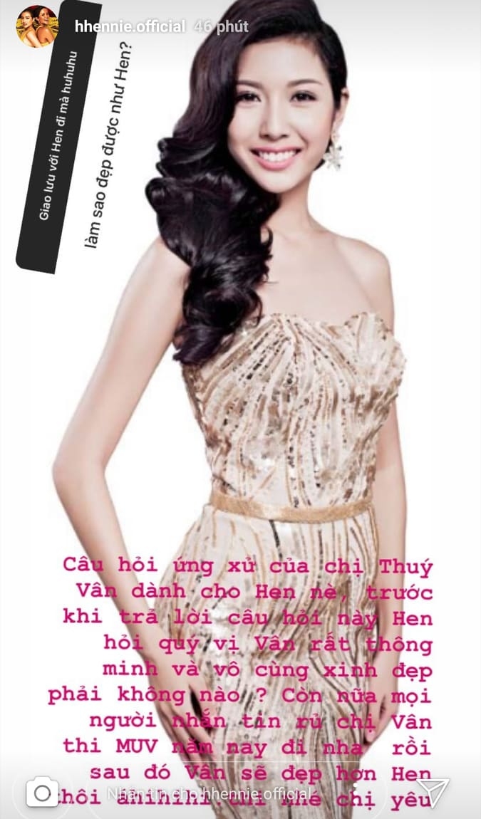 Cộng đồng fan phấn khích khi biết H'Hen Niê ủng hộ Thúy Vân một lần nữa thi nhan sắc và giành cơ hội đến với Miss Universe 2020. Người đẹp Ê Đê còn nhiệt tình hiến kế: “Đẩy đi! Nhắn tin tâm sự hay mở nhóm Ủng hộ chị Thúy Vân đến với Miss Universe Vietnam 2019 đi nè“.