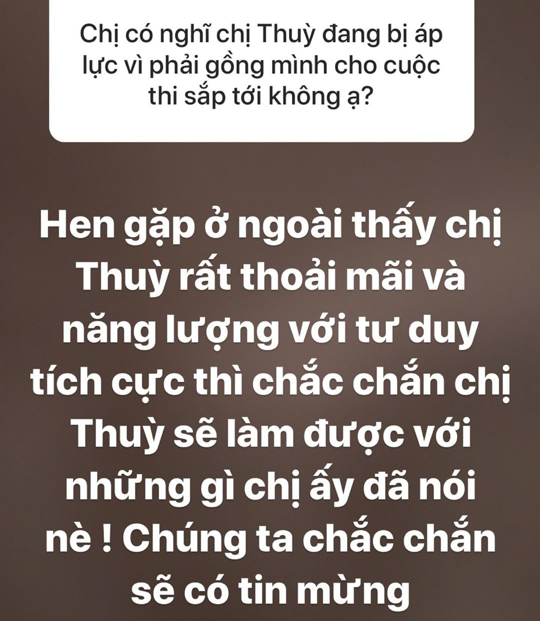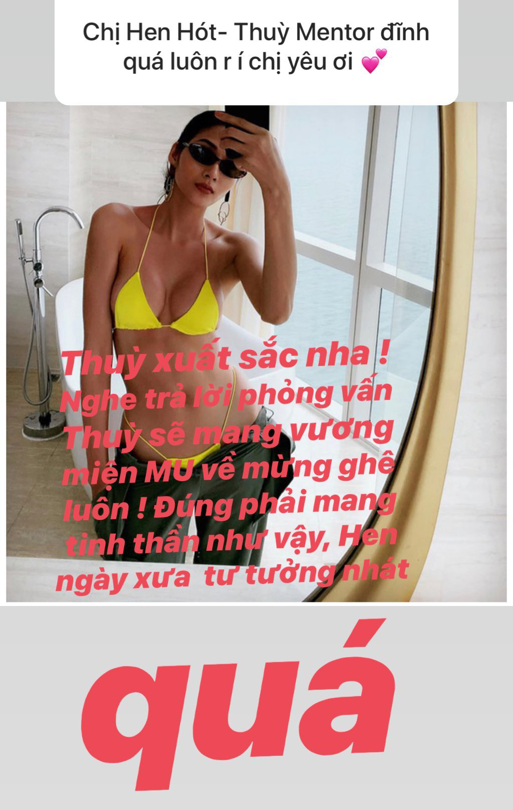 Theo như nhận định của H'Hen Niê, Hoàng Thùy thoải mái và tràn đầy năng lượng. Người đẹp tin rằng với tư duy tích cực, Á hậu 1 - Hoa hậu Hoàn vũ Việt Nam 2017 sẽ tỏa sáng và có được thành tích ấn tượng khi đến với Miss Universe 2019.