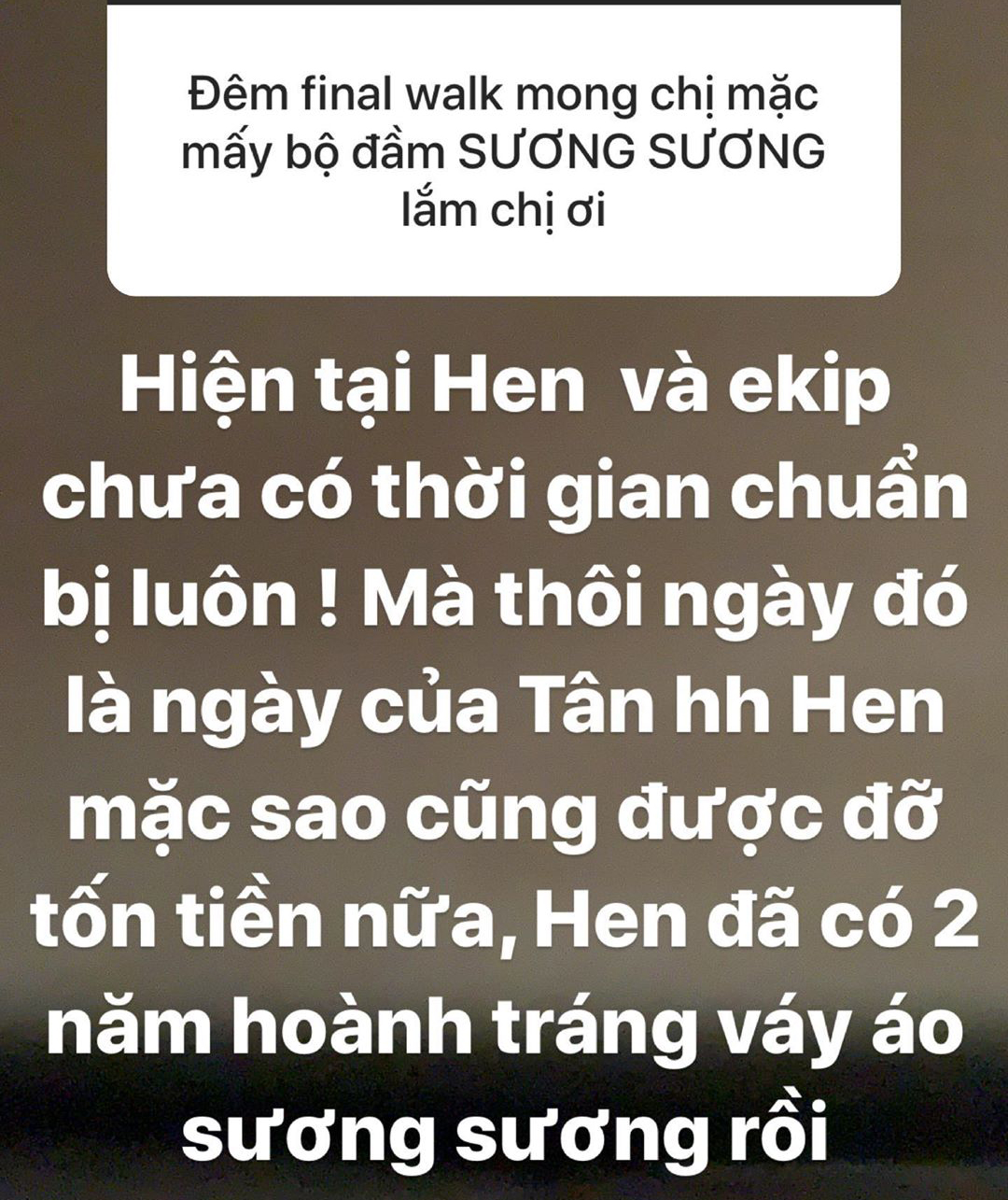 Tâm sự khi được hỏi về khoảnh khắc chia tay nhiệm trên sân khấu Hoa hậu Hoàn vũ Việt Nam, H'Hen Niê cho biết cô nàng và ê-kíp chưa có tính toán cho màn xuất hiện “chiếm spotlight” như dự đoán của các fan. Người đẹp Ê Đê cho rằng bản thân mình đã có 2 năm đương nhiệm rực rỡ váy áo, gây ấn tượng mạnh với nhiều hình tượng khác nhau.