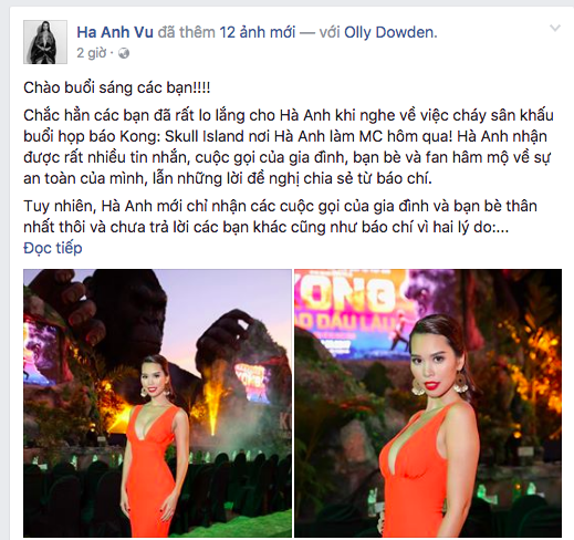 Sau một đêm khó quên, mới đây, Hà Anh đã có những trải lòng trên Facebook cá nhân về đám cháy. Theo đó, Hà Anh cho biết sau sự cố cháy ở sân khấu buổi ra mắt bộ phim Kong: Skull Island, cô nhận được rất nhiều lời hỏi thăm của gia đình, bạn bè và người hâm mộ về sự an toàn của mình.