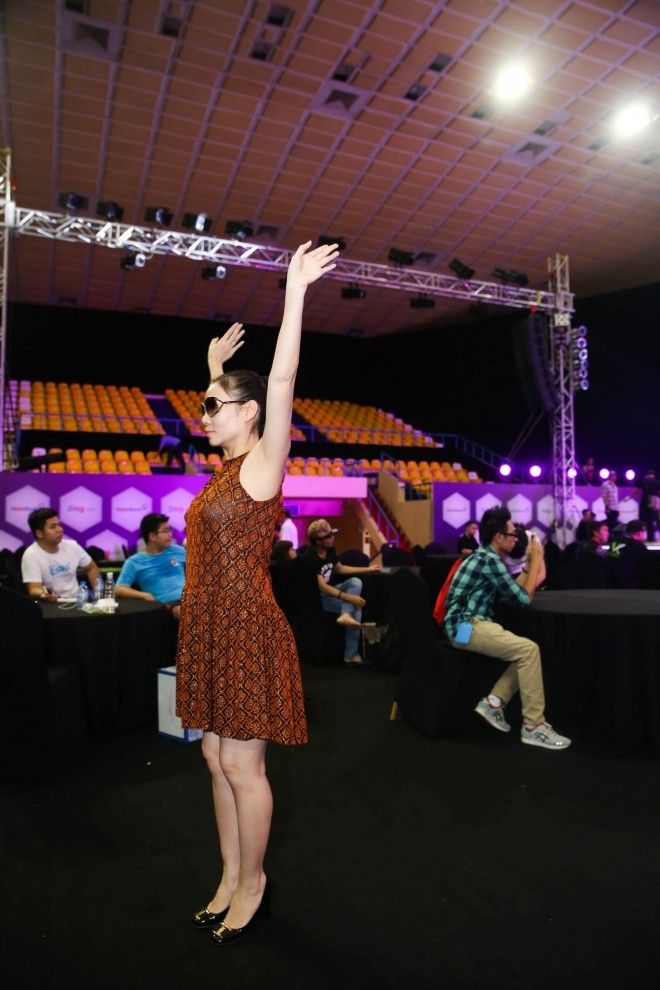 Chọn một góc nhỏ bên ngoài sân khấu, cô cùng các thành viên trong nhóm múaa ôn lại các động tác trong phần trình diễn đặc biệt.