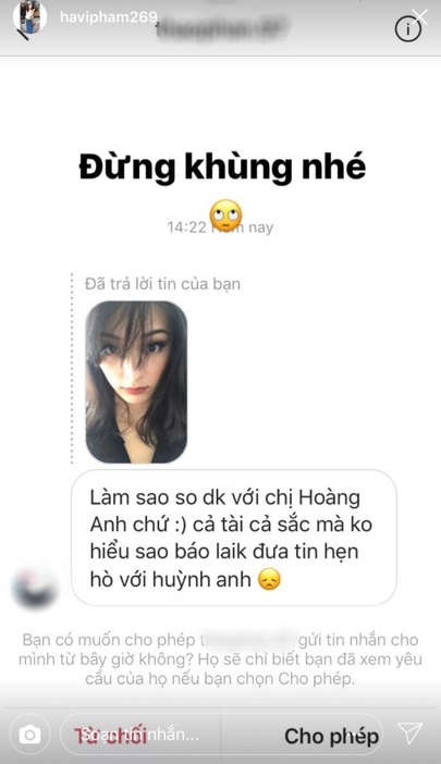 Đỉnh điểm, có fan nữ còn nhắn tin mỉa mai Hạ Vi với nhiều ngôn từ khá nặng nề. Người này viết: “Làm sao bằng được chị Hoàng Oanh chứ. Cả tài lẫn sắc đều không bằng mà không hiểu sao báo chí lại đưa tin hẹn hò với Huỳnh Anh”.
