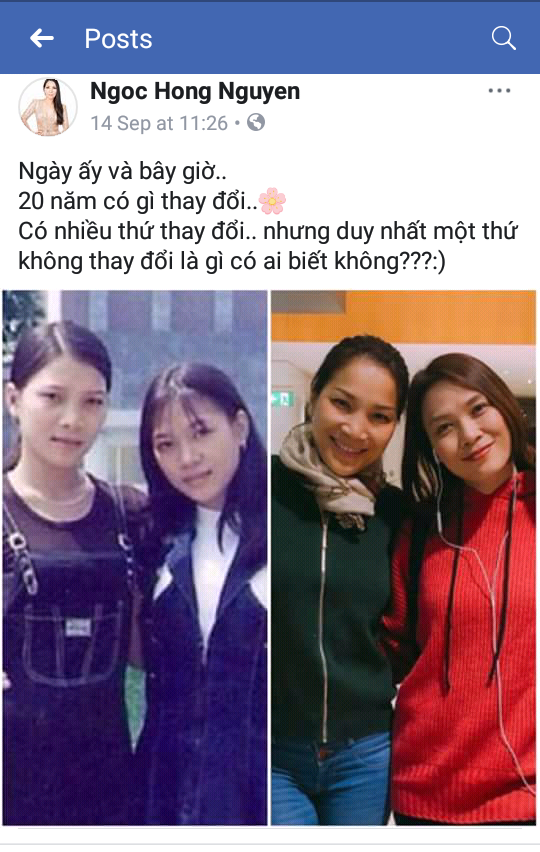 Cụ thể, nữ ca sĩ Hồng Ngọc đã chia sẻ lên trang cá nhân của mình hai tấm ảnh chụp cách nhau 20 năm giữa cô với Mỹ Tâm và dòng trạng thái úp mở rằng: “Ngày ấy và bây giờ… 20 năm có gì thay đổi… có nhiều thứ thay đổi… nhưng duy nhất một thứ không thay đổi là gì có ai biết không???” Dù úp mở như vậy nhưng hầu như ai cũng biết “thứ duy nhất không thay đổi” mà nữ ca sĩ Mắt nai cha cha cha muốn nói chính là tình bạn, tình chị em 20 năm giữa cô và Mỹ Tâm.
