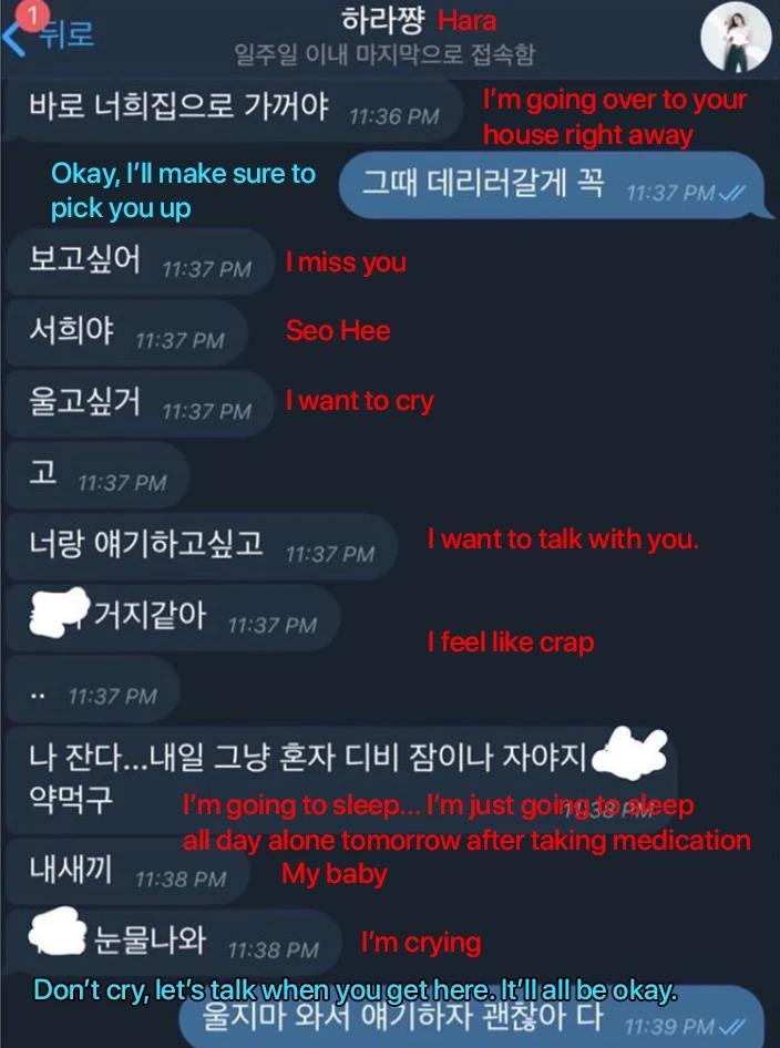 Trong tin nhắn gửi Han Seo Hee chỉ vào tuần trước khi sự việc xảy ra, cô cảm thấy rất buồn và nhớ Han Seo Hee, thậm chí muốn khóc. Goo Hara cũng nảy sinh suy nghĩ tiêu cực:“Chị sẽ ngủ… chị sẽ chỉ ngủ một mình đến mai sau khi uống thuốc. Em yêu. Chị đang khóc”.