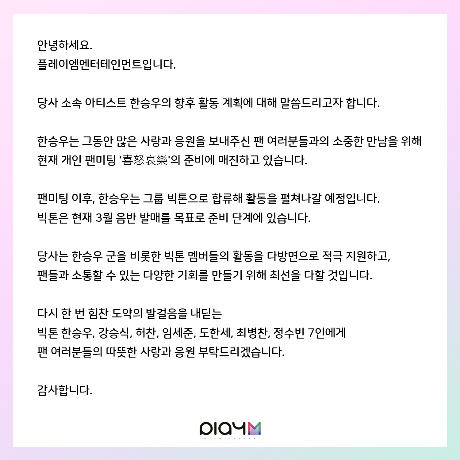 Vào chiều ngày 29/01, công ty quản lý Play M Entertainment đã thông báo rằng chàng trưởng nhóm X1- Han Seung Woo sẽ tiếp tục các hoạt động với tư cách là thành viên của VICTON. Thông qua tài khoản Twitter chính chủ, Play M đã chia sẻ một thông báo với nội dung như sau: