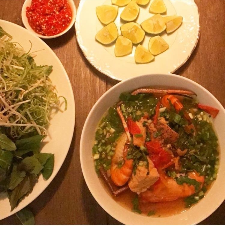 Bún riêu cùng rau đi kèm được cô hoa hậu chuẩn bị trông khá bắt mắt.