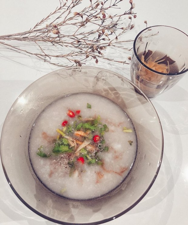 Món cháo mực gạo rang được Lan Khuê chế biến vào nửa đêm.