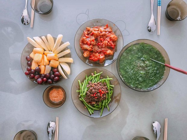 Một bữa ăn gia đình với đầy đủ 3 món: mặn, xào và canh. Bên cạnh đó còn có trái cây tráng miệng.