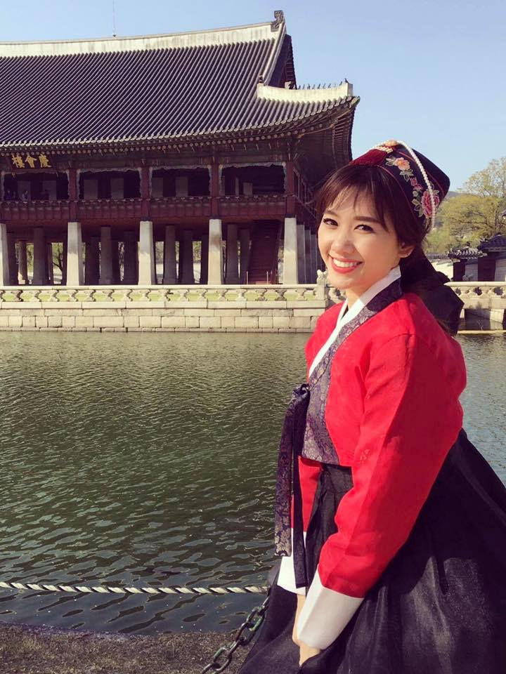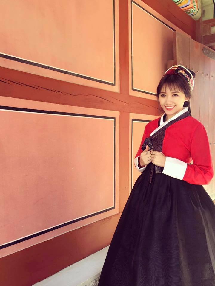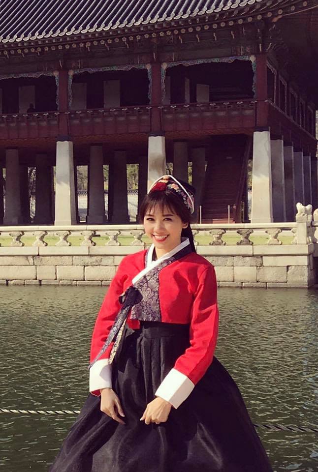 Hari Won xúng xính trong bộ hanbok truyền thống với sắc đỏ làm chủ đạo.
