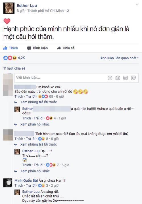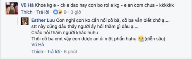 Đáp lại lời “hỏi thăm” từ Vũ Hà, Hari không ngại thừa nhận: “Con nghĩ không cần phải nói cô ba cũng biết chứ ạ. Status này cũng đâu thấy người ấy hỏi thăm gì đâu ạ. Chắc hỏi thăm người khác huhu”.